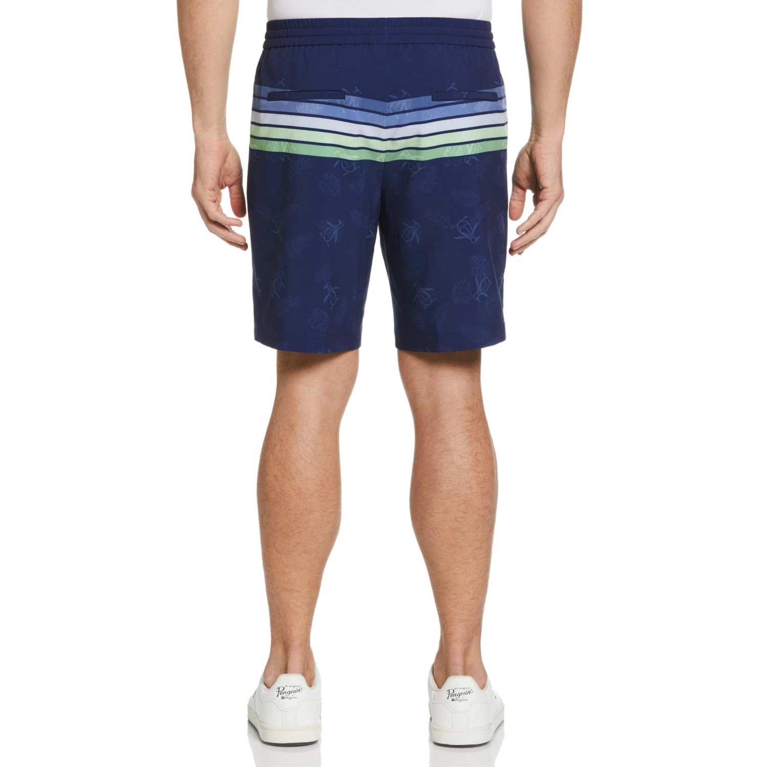 Enjoy lightweight, quick-drying comfort in these versatile boardshorts from Original Penguin. The durable plain weave fabric is water resistant and moisture wicking to help keep you feeling your best in or out of the water. Featuring four-way stretch and a covered elastic drawstring waistband, these shorts allow for flexible all-day comfort. The engineered striped print is eye-catching yet versatile, and features recycled polyester.